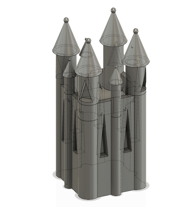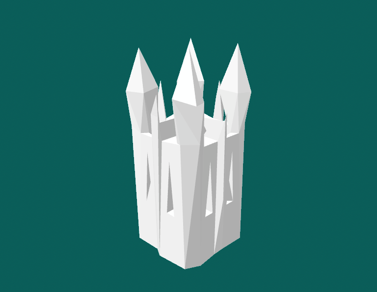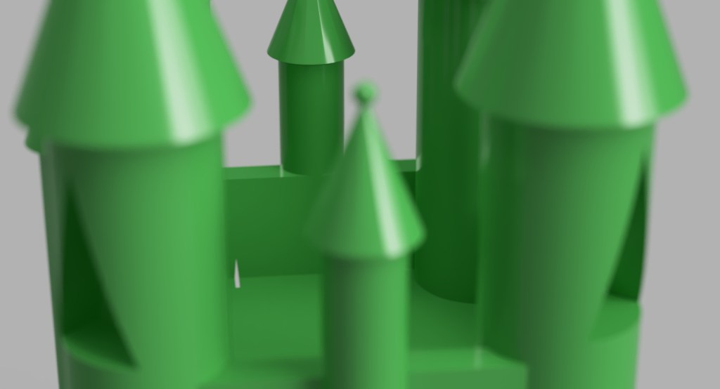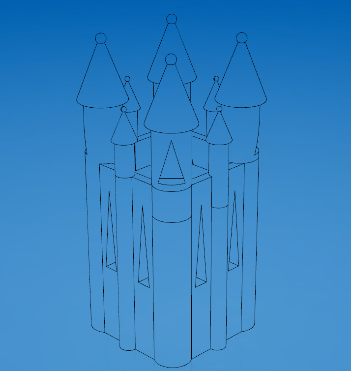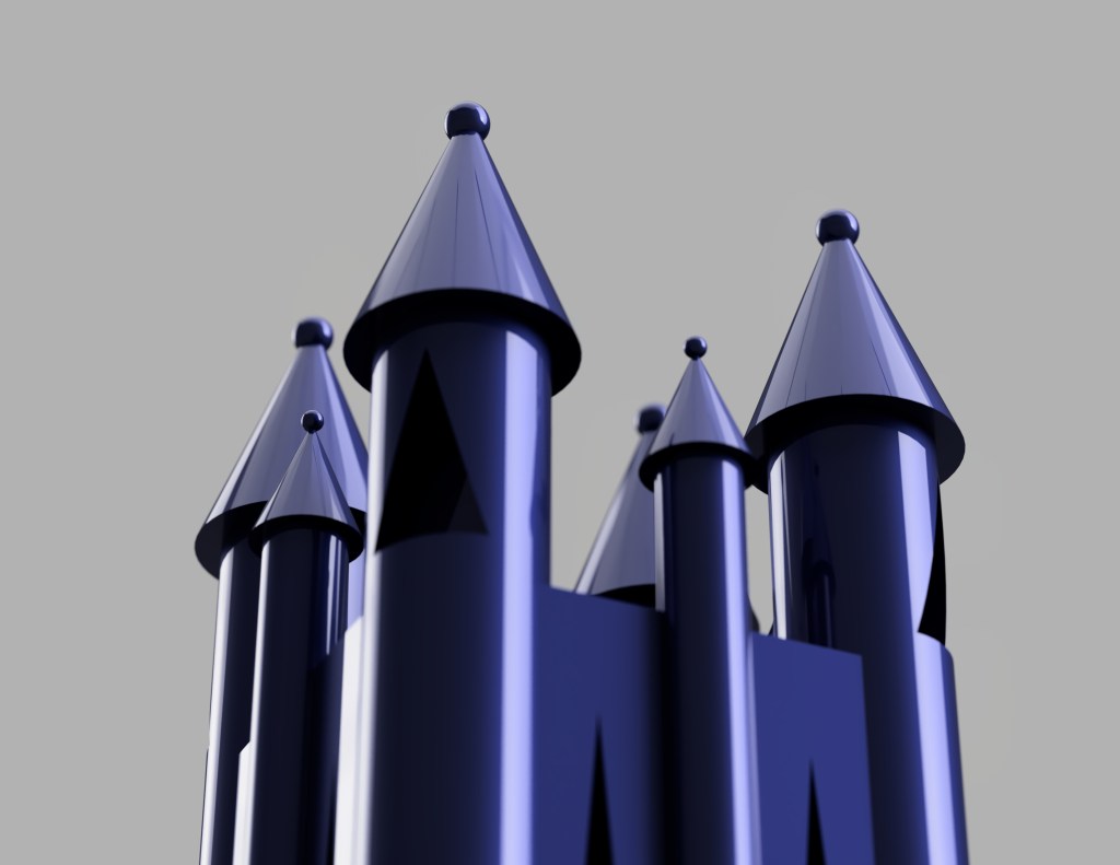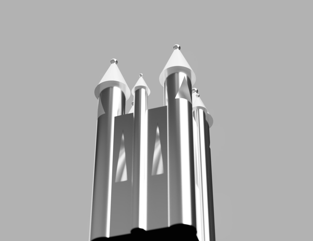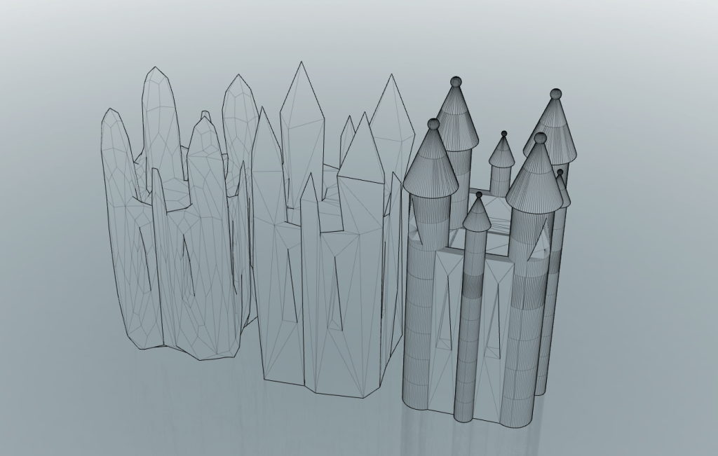 Taking the previous model, I have reduced the definition and applied smoothing to it to see the effect of degradation over time. It almost looks as though the model has become eroded like a rock over thousands of years. This effect is exactly what I expected and takes the model to the point where it is barely tangible as a church anymore and appears as an ameboid blob form. Despite this, I feel it can still be regarded as a castle when viewed alongside the higher definition models, in a similar way that viewing evolution from apes to humans appears clear when viewed with the stages in between, yet when apes and humans are compared it seems much more far fetched.